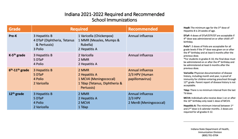 MSD Warren Township in partnership with the Indiana Immunization Coalition will be providing a clinic to accommodate the flu shot, immunizations required for school age children and the COVID vaccine for individuals 12 years and older  on Wednesday, September 29th and Thursday, October 21st at Moorhead Community Resource Center from 4:00 - 7:00. Families are encouraged to pre-register for this event. The registration link for the immunization clinic is patients.vaxcare.com/registration.  After clicking on the link, enter the enrollment code, IN65942, and then select Warren Schools-9/29 or Warren Schools-10/21. Below are the required immunizations for school age children.